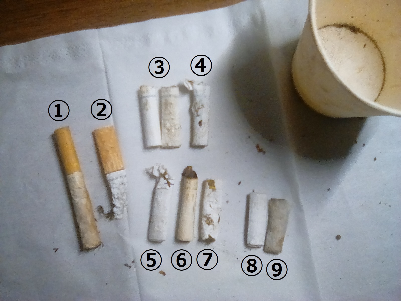たぶん2024年の終わりごろか、2025年の初めごろくらいの時期にタバコの吸い殻を畑に投げ込まれるようになった。2025年7月下旬ごろからタバコの吸い殻を紙コップの中に入れて証拠として集めるようになり、今のところ2025年9月中旬までほぼ毎週畑でタバコの吸い殻を見つけて拾っている。10月下旬に再びタバコの吸い殻を発見。白いタバコ1、こげ茶ではなく明るめの茶色のタバコ1(いつも落ちているのは白いタバコで、この根本が茶色のタバコは初めて見る)。その後はタバコの吸い殻を見つけられなくなり今や12月下旬。年末に、タバコの吸い殻をふだん投げ込まれている辺の延長線上にあるふだんは私が近づかない場所(というのも物置の裏側のため)で、親戚の方がタバコの吸い殻を発見。その吸い殻はその親戚の方が処分しており、私は未回収。要はこの親戚の方が見つけた吸い殻は以下で紹介する画像には未掲載。その後、年内に再び白1。年明けの2026年1月に茶色1。タバコの吸い殻の投げ込みは火災につながるおそれがある。▼ちなみに10月は土地家屋調査士試験の筆記試験が行われる月で、1月は土地家屋調査士試験の口述試験が行われる月です(10月と1月のみ茶色のタバコを拾っている)。